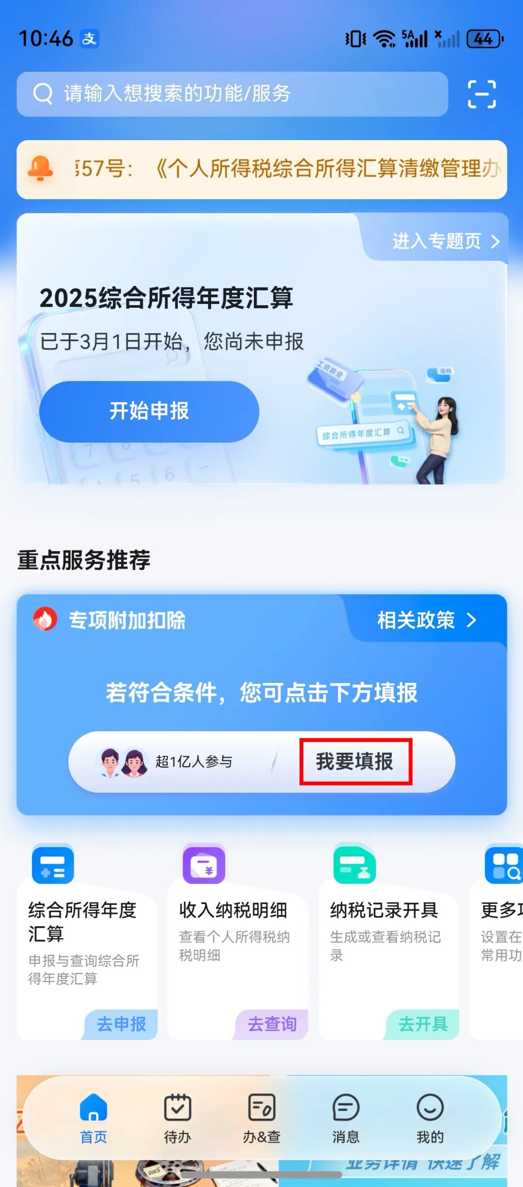 登录个人所得税APP,在专项附加扣除标签页,点击“我要填报”