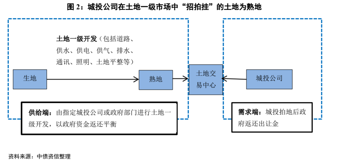 由于相关的法律法规只规定了经营性用地需要通过“招拍挂”的方式获得,而并没有规定“招拍挂”中经营性土地的状态(生地或熟地),未明确禁止生地参与“招拍挂”,故部分地方的城投公司利用政策的回旋余地,在土地一级市场中购买的土地实际上为生地,并在购地后对土地需进行开发整理再出让,实质上承担了部分土地储备的职能。