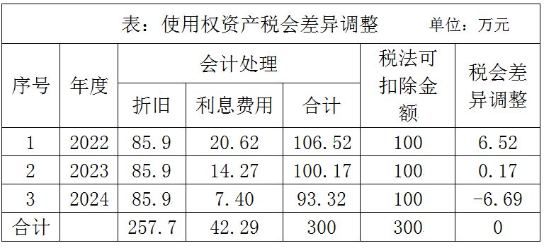 根据新租赁准则计算,甲公司折现使用权资产257.7万元(按照利率为8%、3年期的年金现值系数计算),未确认融资费用为42.29万元。现甲公司正进行2022年企业所得税汇算清缴,甲公司租入的这幢写字楼,2022年租赁资产折旧为85.90万元,利息摊销为20.62万元,合计106.52万元,在2022年申报企业所得税全额扣除。